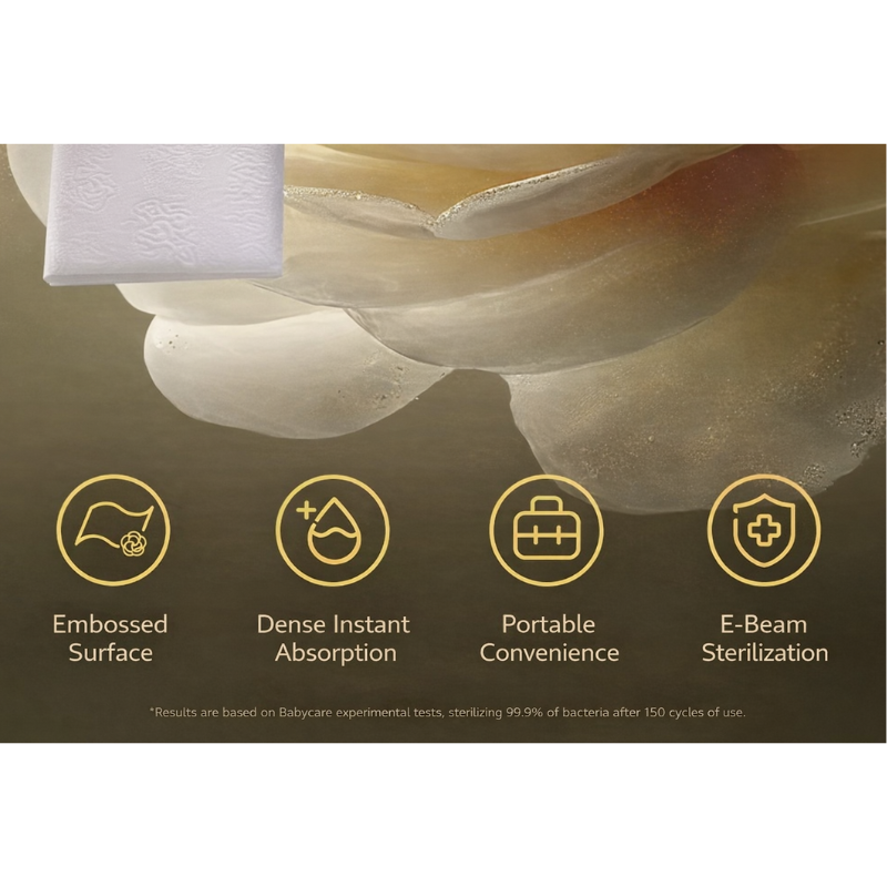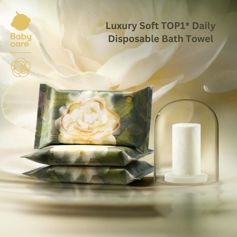 Soft, hygienic disposable bath towel made with plant-based fibers and enriched with Golden Camellia extract. Gentle on sensitive skin, highly absorbent, and E-beam sterilized for safety. Lightweight, portable, and ideal for newborns, travel, or hospital use.