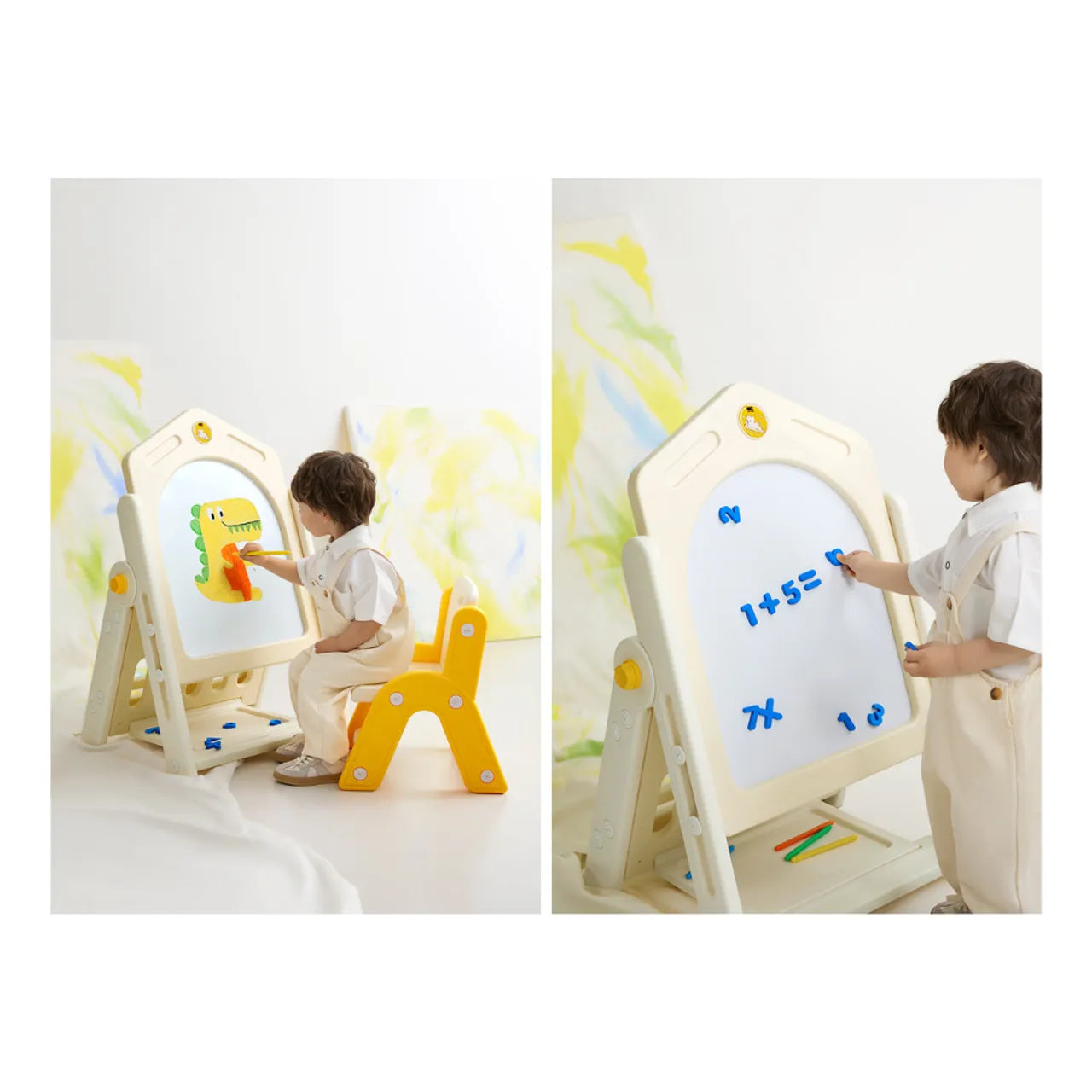 The Interactive Magnetic Drawing Board with a comfortable chair and fun accessories offers a creative, mess-free learning experience. Perfect for doodling, practicing numbers, and writing letters, it inspires imagination while helping preschoolers develop fine motor skills, focus, and creativity through play.