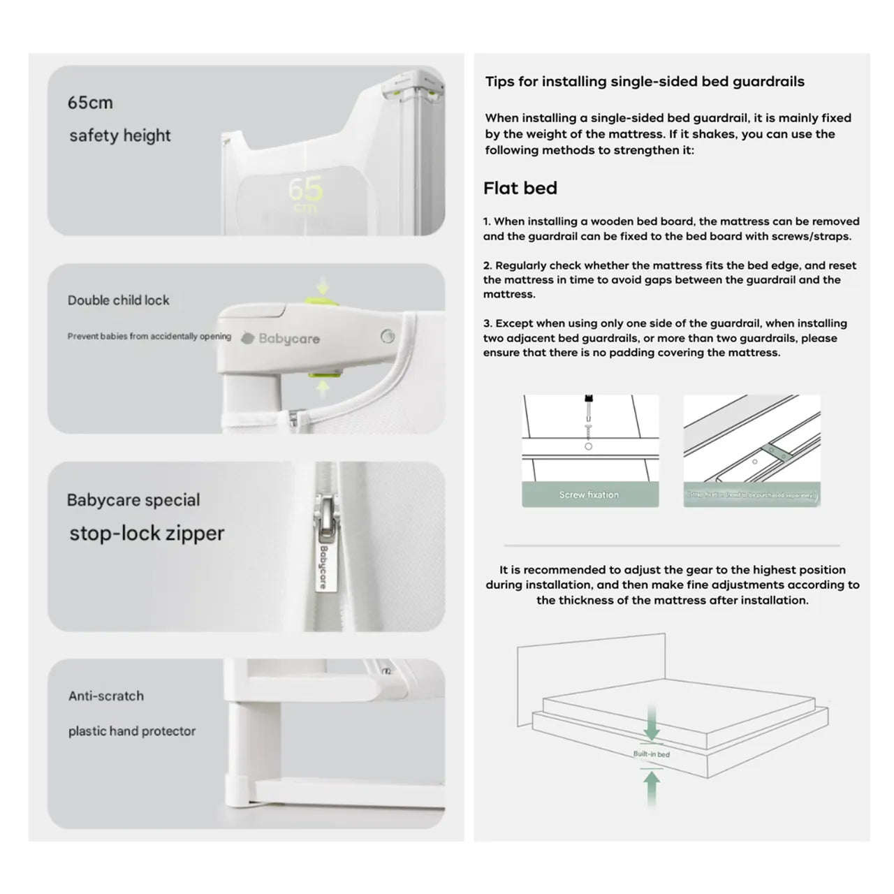 Keep your little one safe and secure during sleep with the Babycare Baby Bedrail. Designed to prevent accidental rolling out of bed, it features a sturdy frame with durable fabric and breathable mesh for comfort and visibility. The adjustable design fits most bed sizes, while the easy installation system with a secure, lockable mechanism ensures stability and peace of mind for parents.