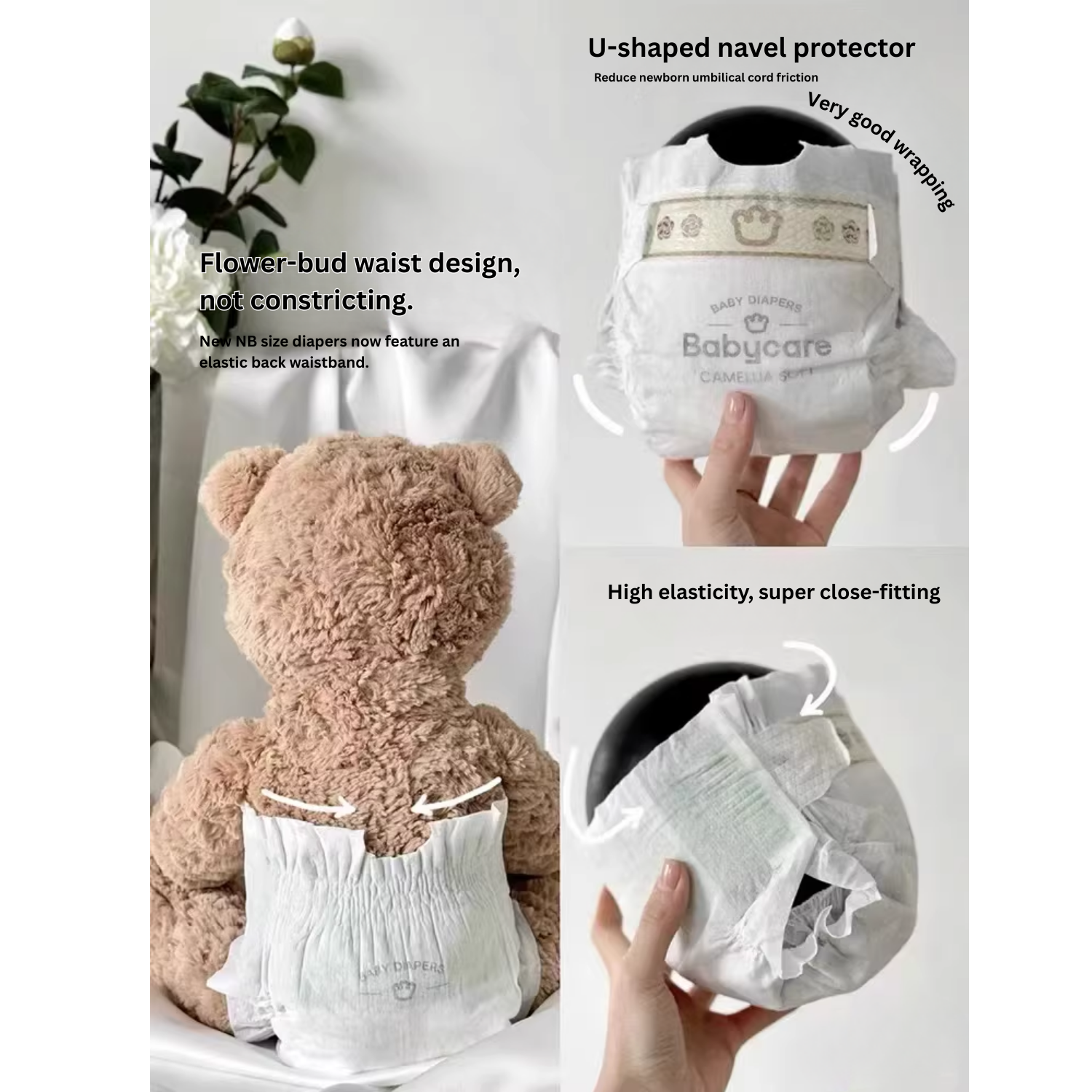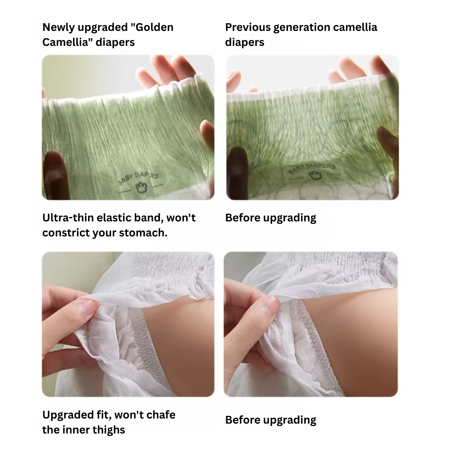 Experience next-level comfort and care with our premium baby diapers, designed with gentle, skin-friendly materials and advanced technology to keep your little one happy and dry. The upgraded ultra-fine fibers are incredibly soft, while natural Golden Camellia Extract nourishes and protects delicate skin. With a seamless, elastic fit, fast-absorbing bionic core, and ultra-breathable design, these diapers provide maximum comfort, leak protection, and all-day dryness for your baby.