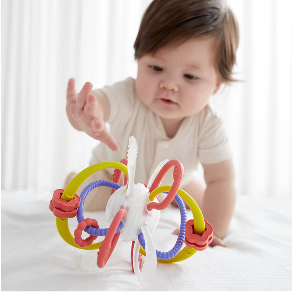 - Built-in rattle adds auditory stimulation