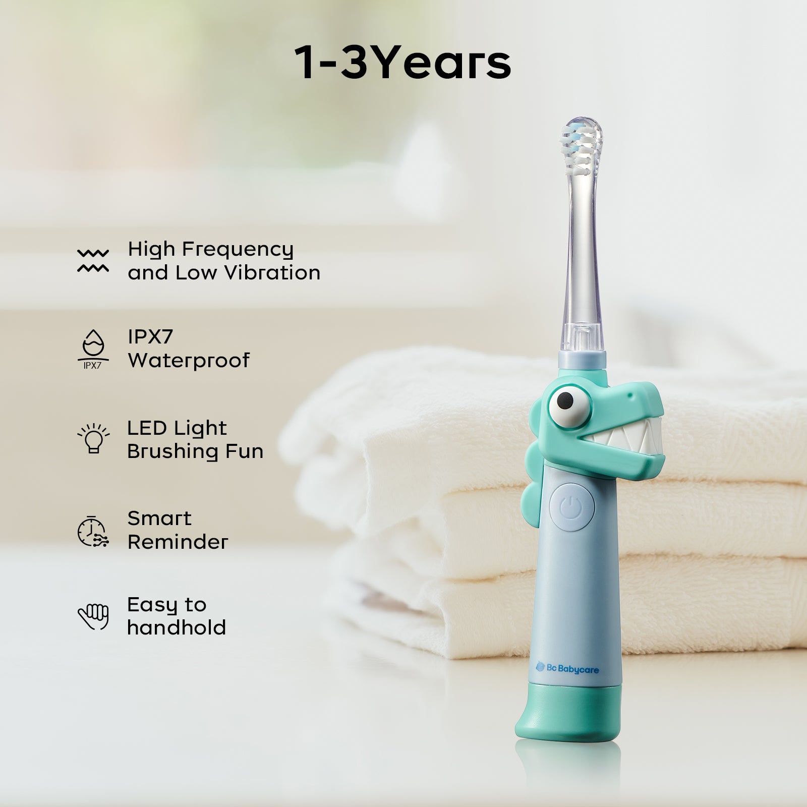 The Babycare T-REX Toby Electric Toothbrush is specially designed for toddlers aged 1 to 3 years old. Featuring a fun dinosaur (T-Rex) design, it encourages little ones to develop healthy brushing habits from an early age. The toothbrush is gentle on young gums and teeth, making oral care both effective and enjoyable.