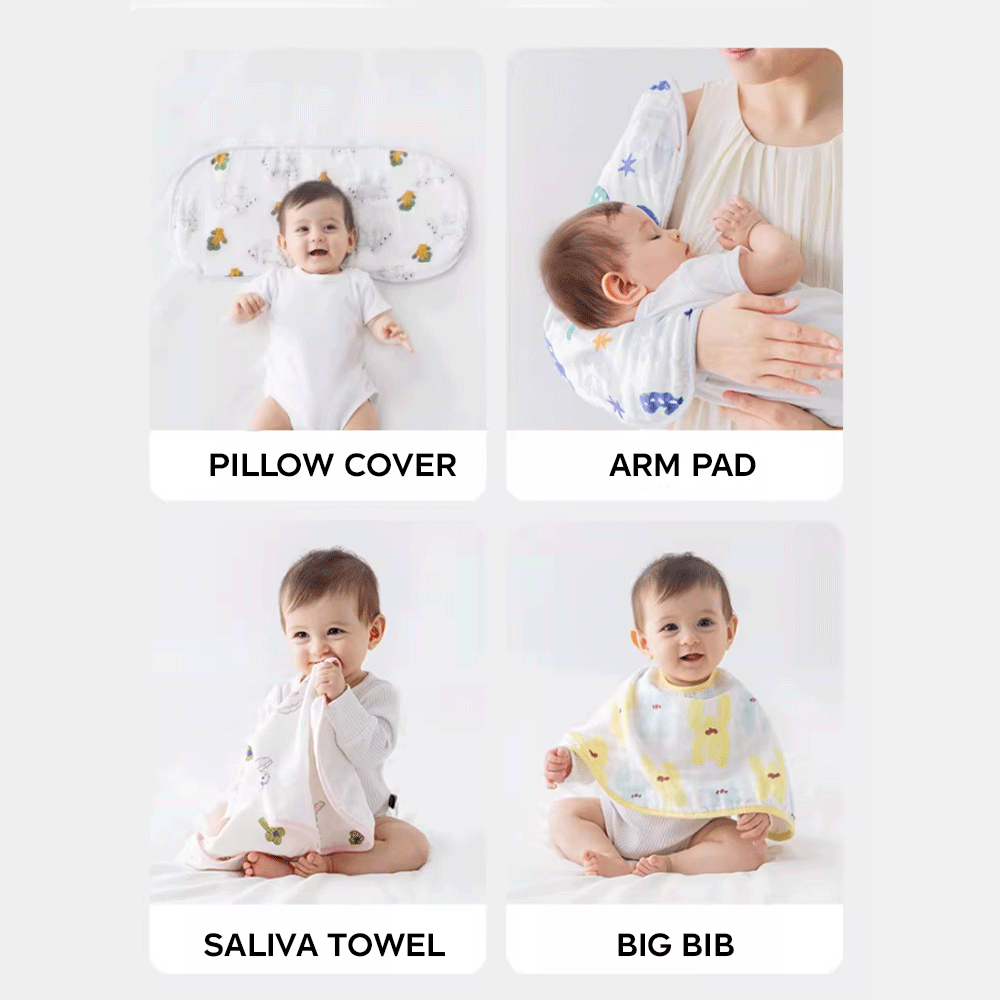 4-in-1 Multi-Functional Design: This product seamlessly transitions between a Big Bib for full-coverage feeding, a Pillow Cover to absorb moisture during rest, an Arm Pad for comfortable cradling, and a Saliva Towel for quick clean-ups.