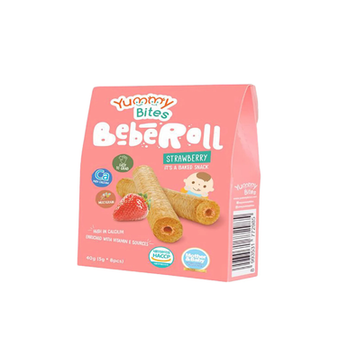 This carton pack of Beberoll strawberry-flavored roll snacks is suitable for children from 9 months of age. Made from 8 types of Korean grains, the light and easy-to-hold shape helps support early motor development. The texture is gentle for babies learning to chew, and each flavor provides minerals such as calcium and phosphorus. The range includes 6 flavors: Cheese, Strawberry, Blueberry, Orange, Banana, and Chocolate.