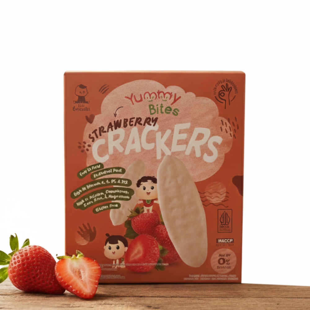 Yummy Bites Rice Crackers with Strawberry Flavor come in a carton pack containing 12 sachets with a total of 24 pieces. Suitable for children aged 6 months and above, these rice crackers have a light texture that melts easily in the mouth. They are free from common allergens and made with selected ingredients to support safe snacking.