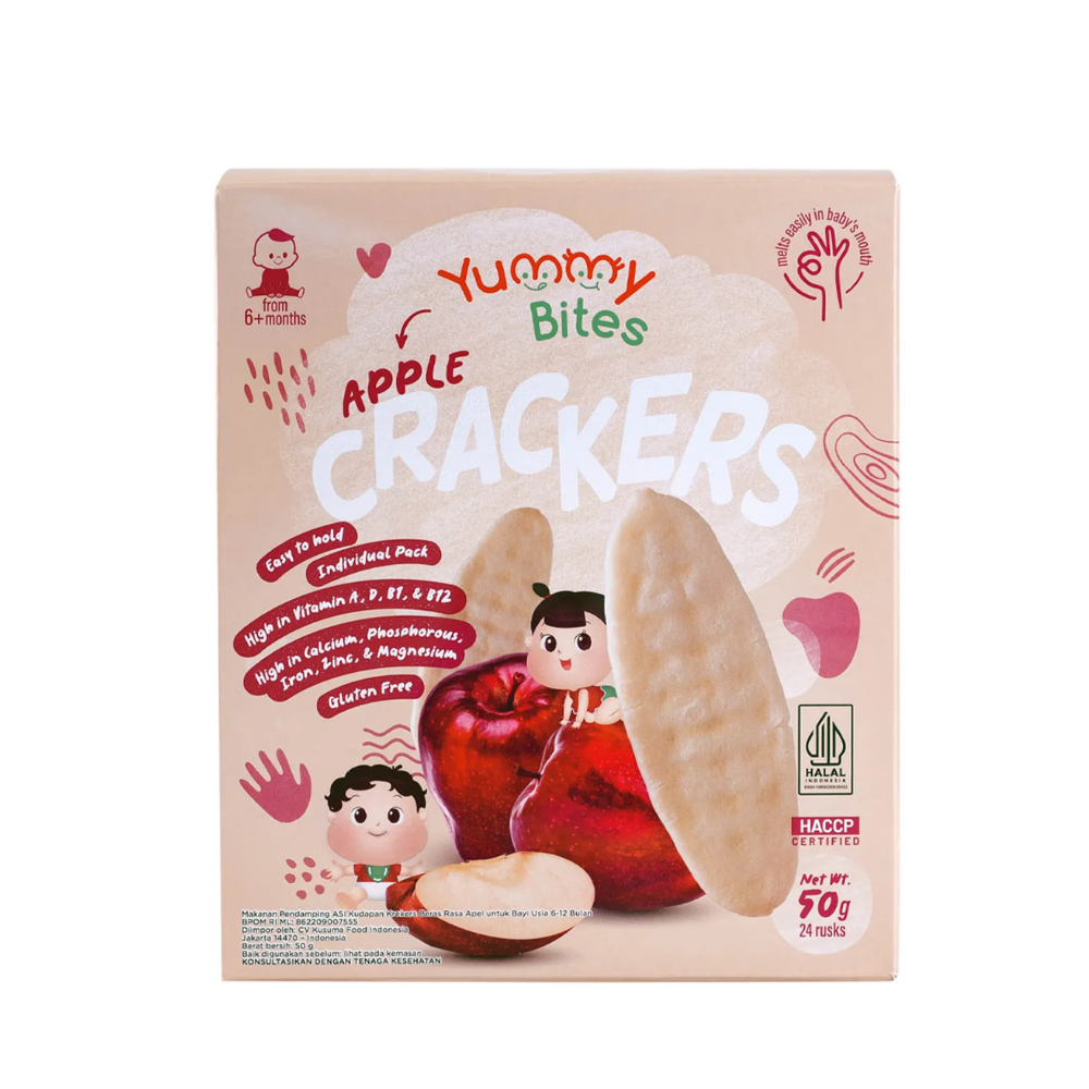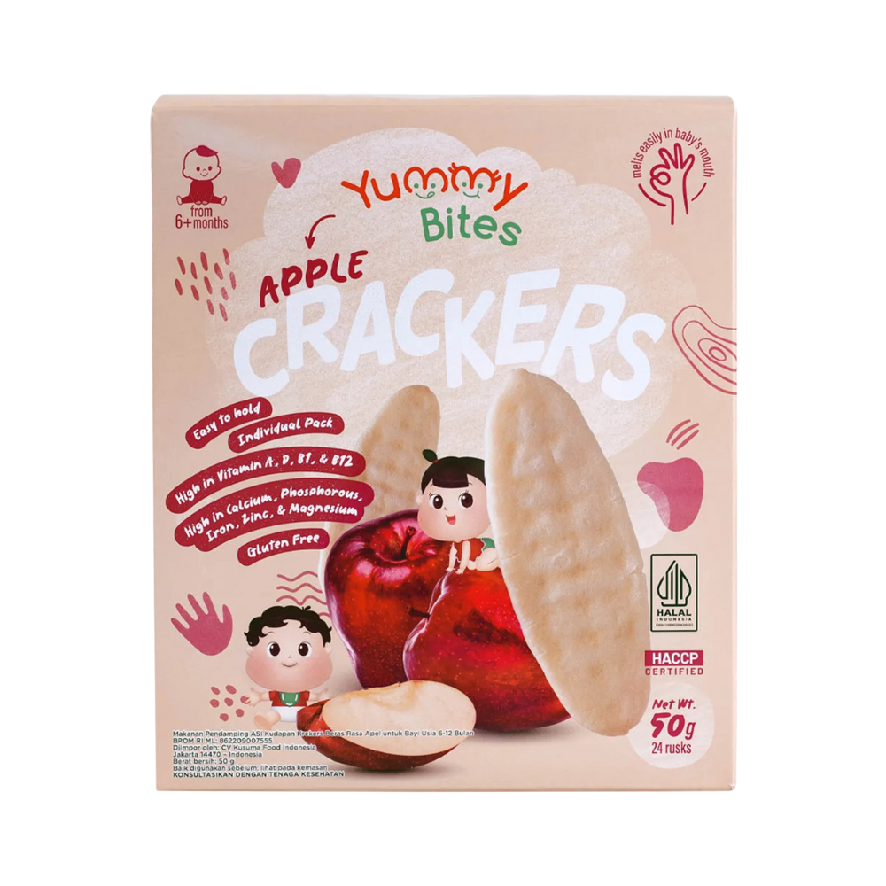 Rice Cracker Apple Yummy Bites are delicious teething biscuits specially crafted for babies aged 6 months and above. Made with apple flavor, these crunchy yet soft rice crackers melt easily in your baby’s mouth, making snack time safe and enjoyable. Each pack contains 12 sachets, with a total of 24 pieces, perfect for on-the-go feeding.