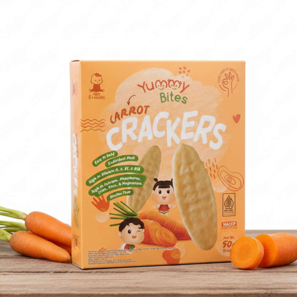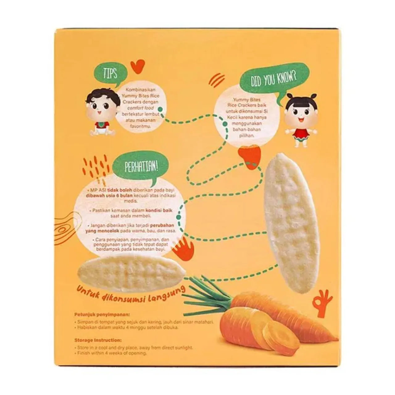 Yummy Bites Rice Crackers with Carrot Flavor come in a carton pack containing 12 sachets with a total of 24 pieces. Suitable for children aged 6 months and above, these rice crackers have a light texture that melts easily in the mouth. They are free from common allergens and made with selected ingredients to support safe snacking.