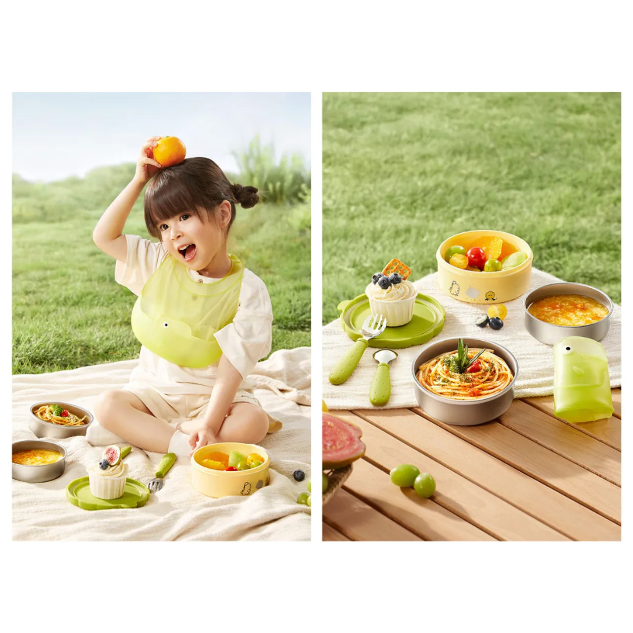 - 7-in-1 set includes bib, bowl, stainless steel inserts, spoon, and fork