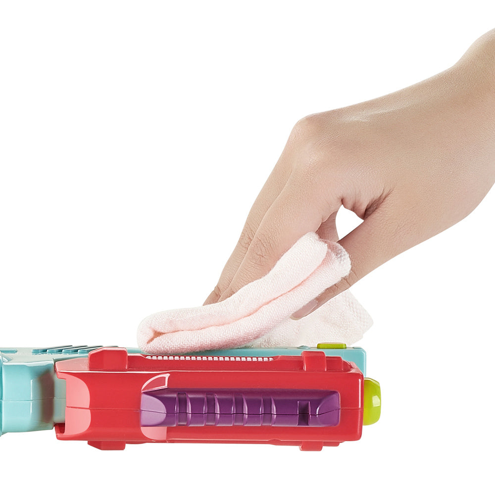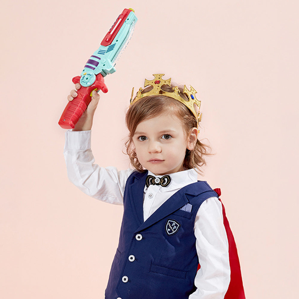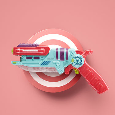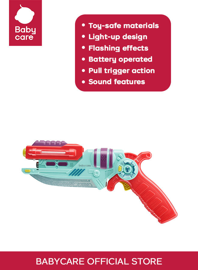 Babycare Flash Toy Gun offers four exciting forms: energy pistol, laser rifle, flash dagger, and laser sword. Features a volume of 75 decibels to protect both your baby's hearing and adults' comfort. The toy's patented futuristic design includes a smooth, rounded surface with no sharp corners, ensuring safe and enjoyable play for little ones.