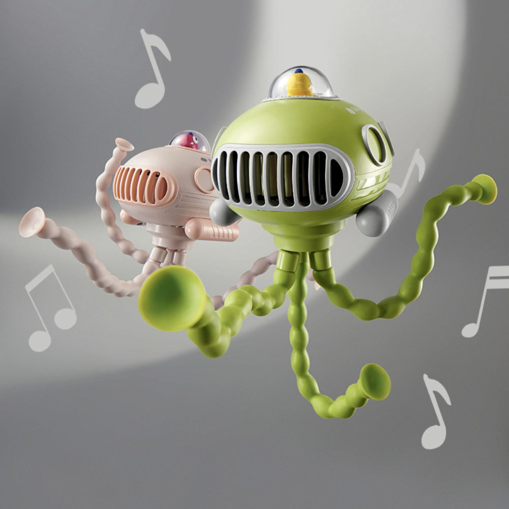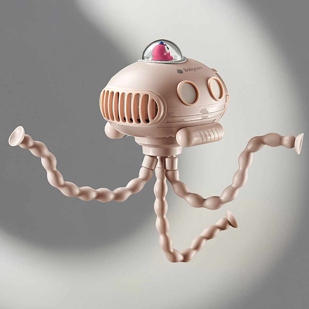 Babycare Portable Fan combines soothing features with practicality. It offers soft lighting and 10 built-in BGMs for a relaxing experience. The fan can be wound or stand upright, with a silicone suction cup that adheres firmly, and a fine grid designed to protect small hands. It features a durable design, capable of withstanding thousands of bends.