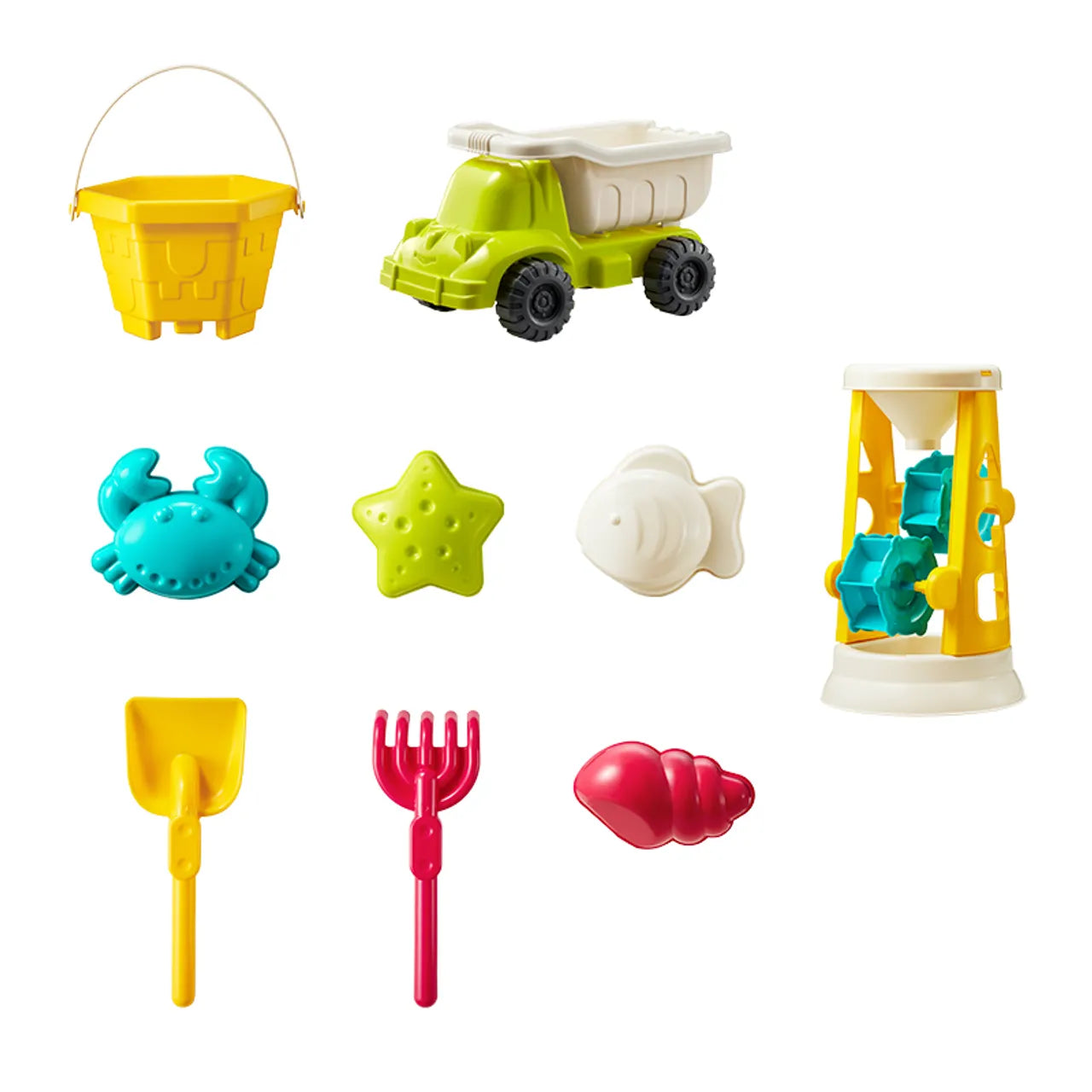 • Complete set with bucket, shovel, rake, molds, toy truck, and water wheel