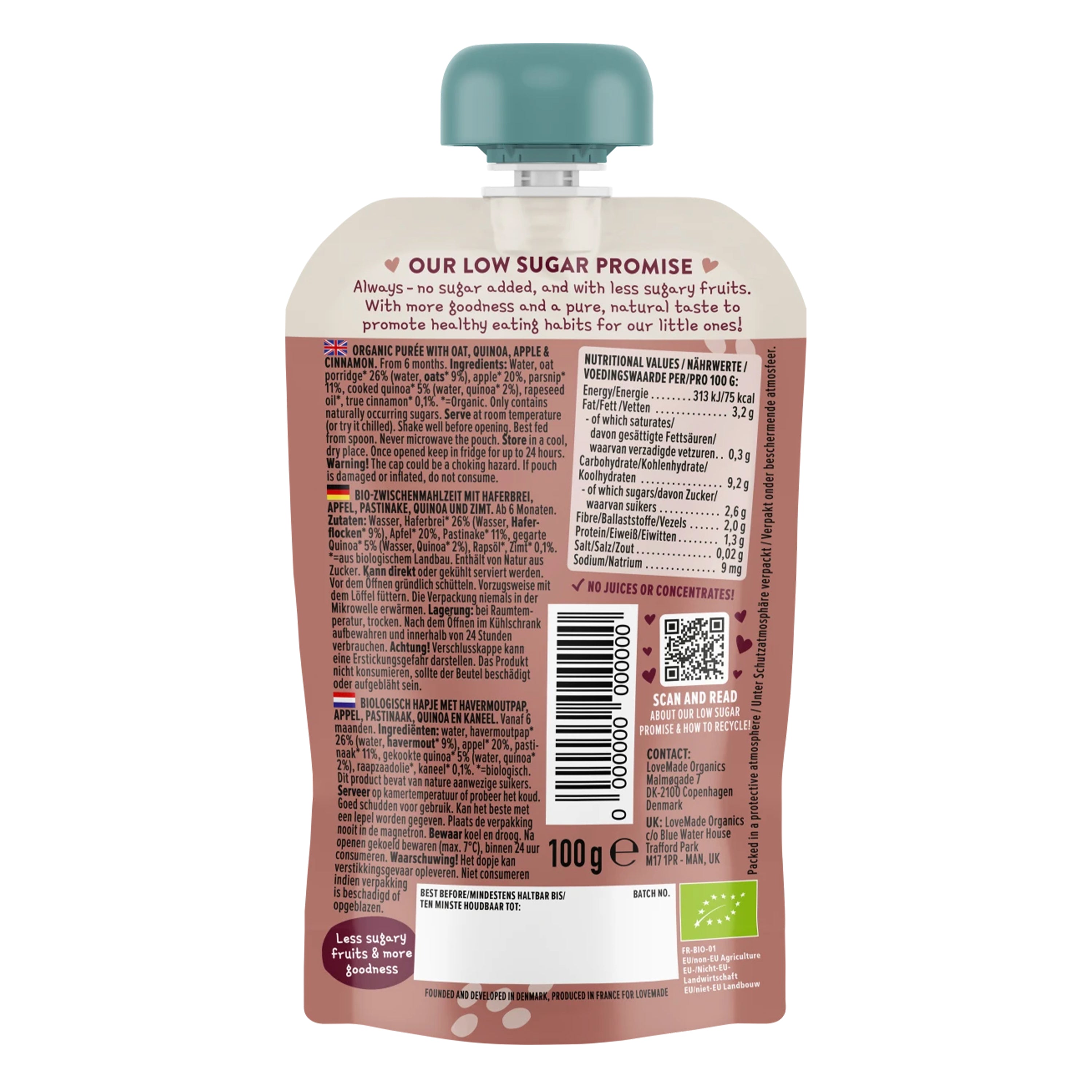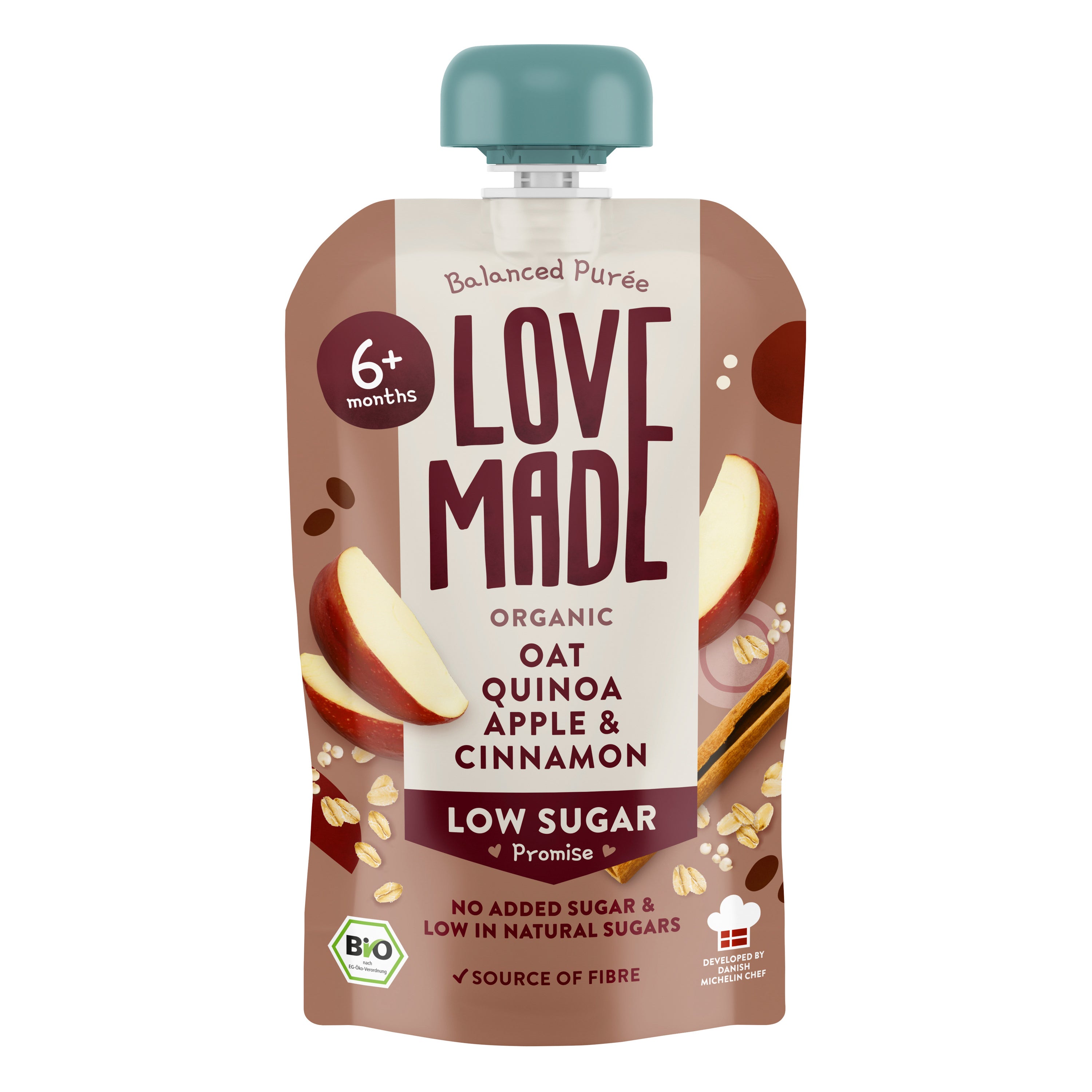 Love Made Organic porridge with oats, quinoa, parsnips, apple, real cinnamon and rapeseed oil. Low sugar content! Contains only 2.6 g sugars per. 100 g. Created by dedicated parents and michelin starred chef, LoveMade has both quality and taste you can trsust.