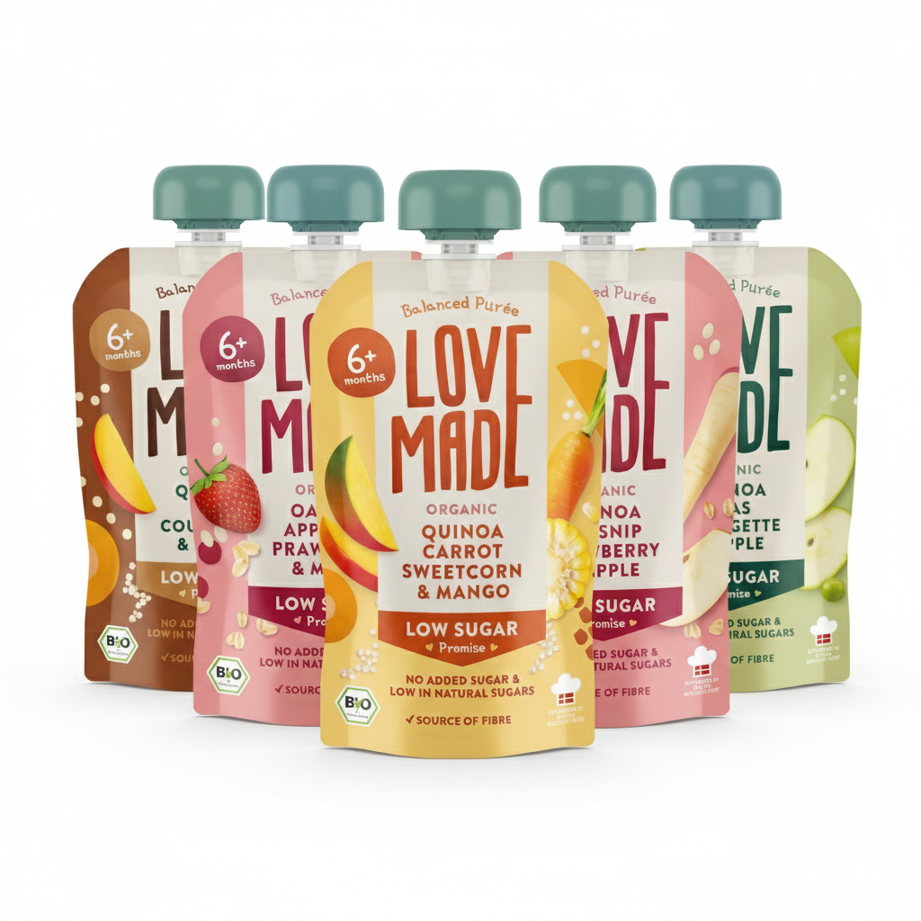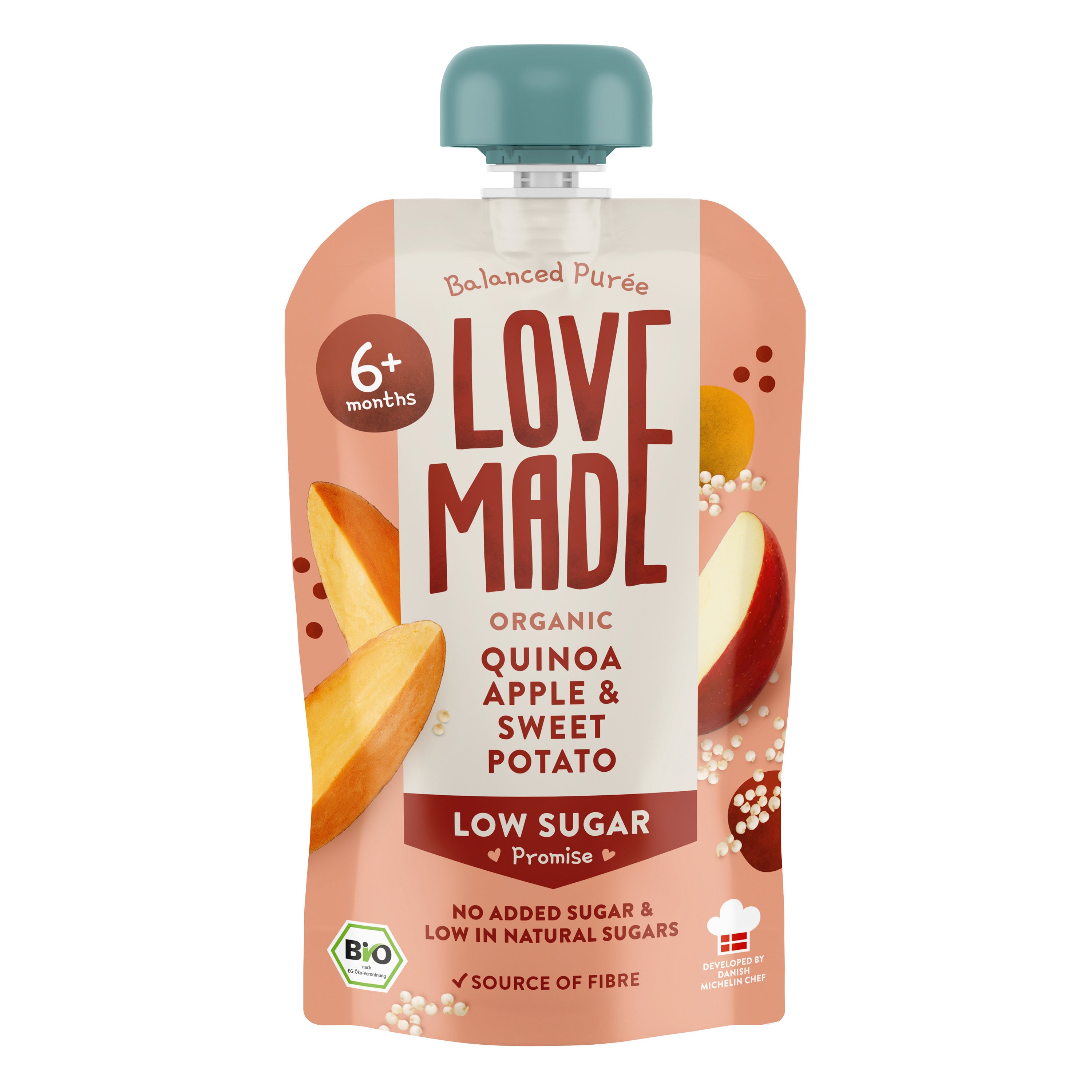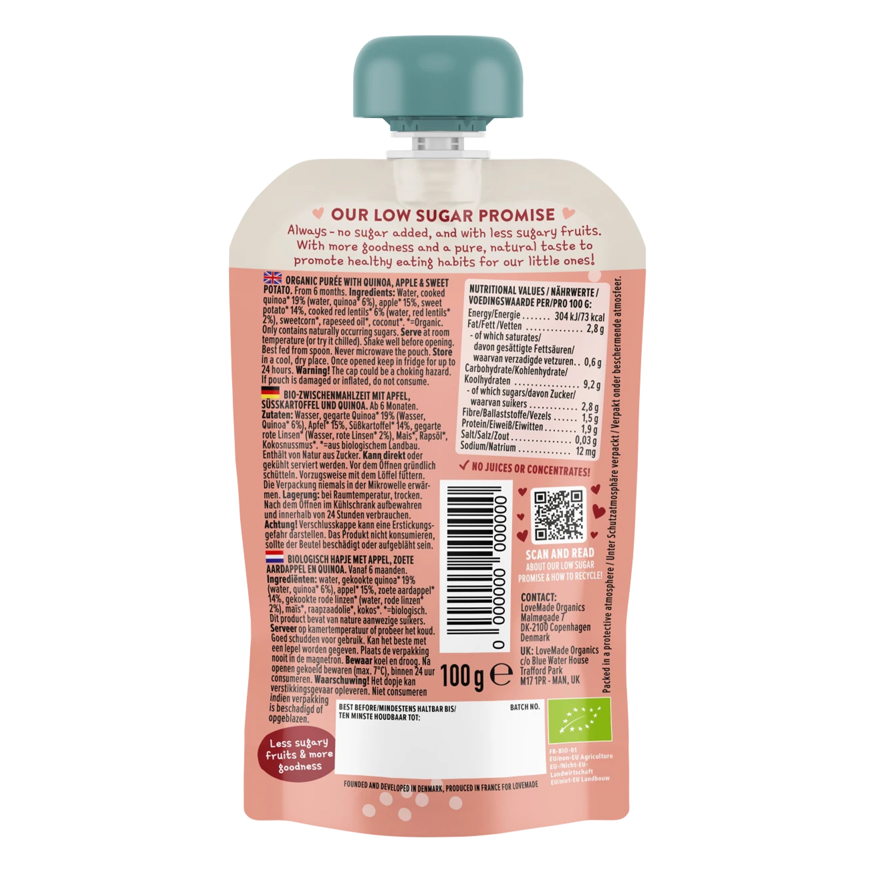 Love Made Organic Quinoa, Apple & Sweet Potato Purée is a carefully balanced baby food designed for babies from 6 months onwards. This smooth and nourishing blend combines organic quinoa with naturally sweet apple and sweet potato to deliver gentle nutrition and a mild taste babies love. Made with no added sugar and low natural sugar content, it supports healthy eating habits from the start while providing a natural source of fibre. The convenient squeeze pouch makes feeding simple, whether at home or on the go.